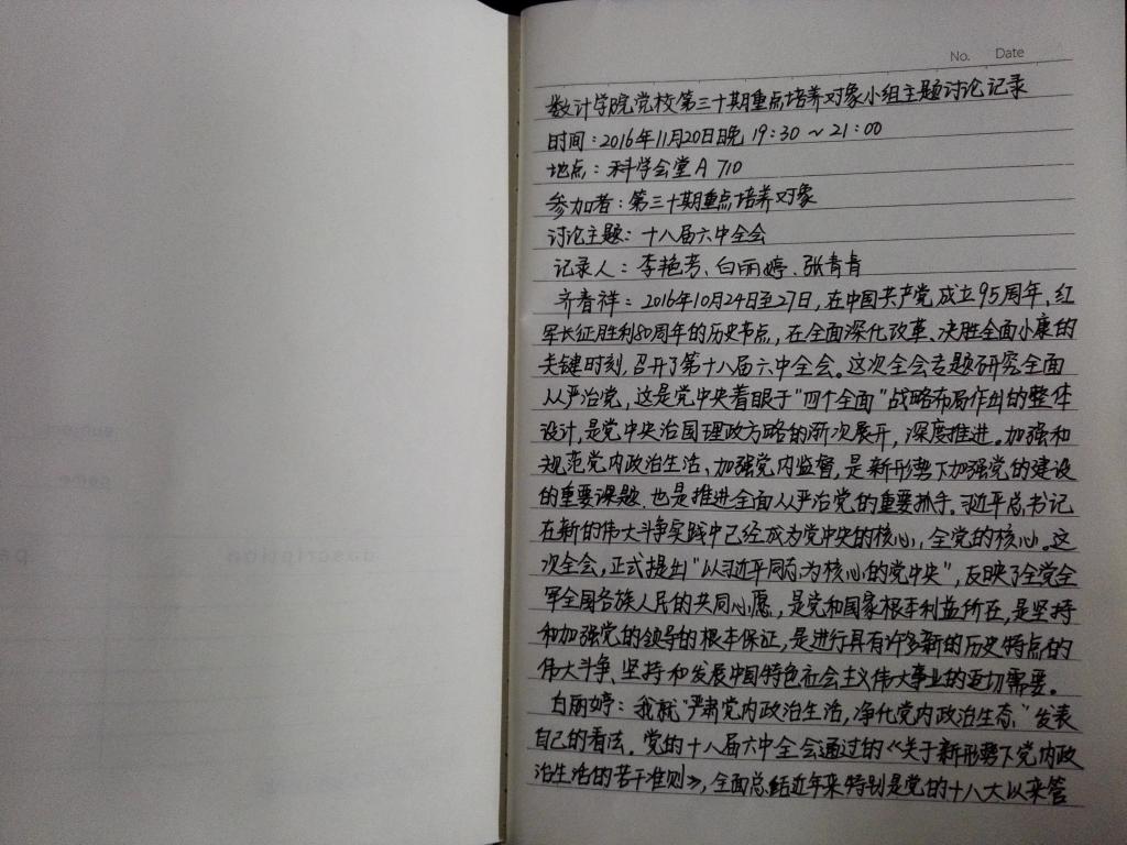 2016年11月20日晚7点半,在中共太阳集团官方网站党校相关教师的指导监督下,公司第30期重点培养对象培训班在科学会堂710举办了十八届六中全会心得体会为专题的小组讨论。第30期重点培养对象培训班全体成员共27人参加了此次小组讨论,此次讨论由负责人齐春祥主持。