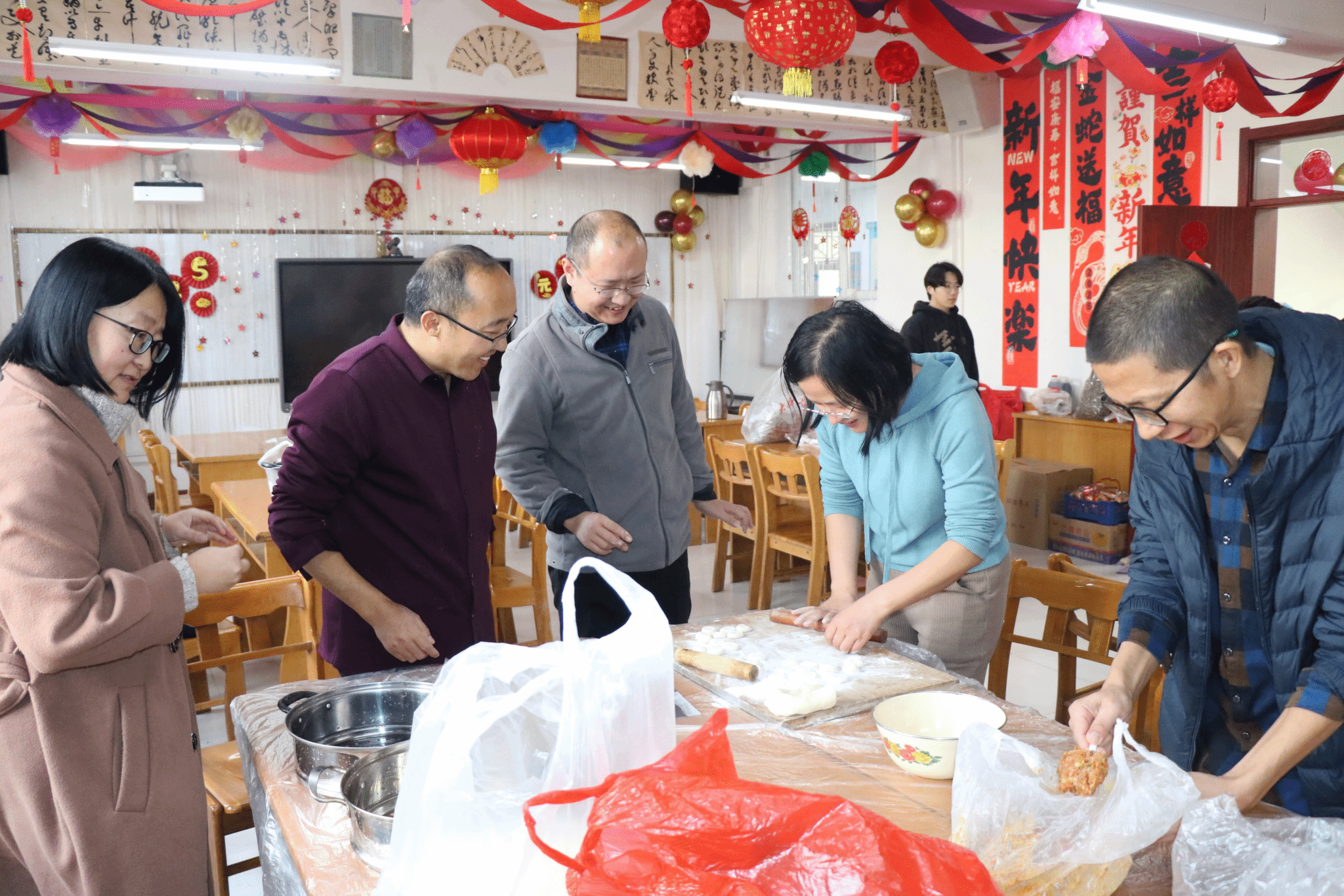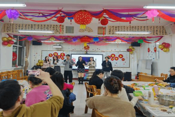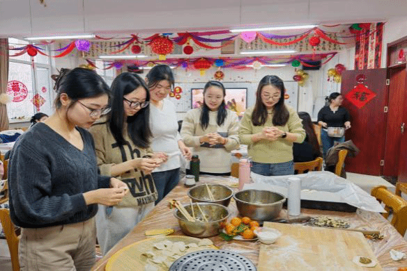 活动伊始,大家围坐在一起,纷纷投入到包饺子环节。老师与同学们一同动手,大家分工合作,和面、擀皮、包馅,忙得不亦乐乎。尽管有些饺子的形状不尽完美,但包饺子的过程充满了欢声笑语,展现了师生之间的亲密无间。在包完饺子后,大家的兴致依然高涨,不少教工提议来几局轻松的扑克牌游戏,而另一些则拉开了K歌的序幕,一时间教室里歌声与笑声交织在一起。包好的饺子被送到餐桌上,同学们和老师们一起品尝,饺子里的每一份温暖都传递着新年的祝福与期许。