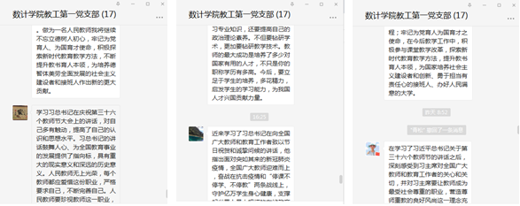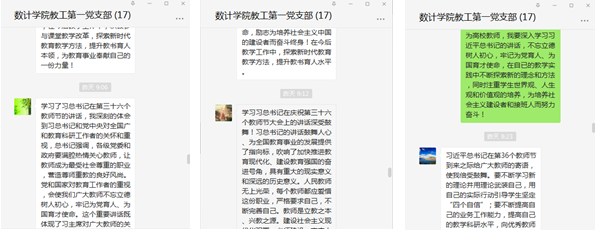 按照公司的安排,结合支部实际,我支部组织党员进行了线下自学《习近平谈治国理政》第三卷和习近平在教师节上的讲话精神,并于9月15日进行了“牢记领袖对高校教师嘱托,努力培养社会主义建设者和接班人”线上学习交流活动。